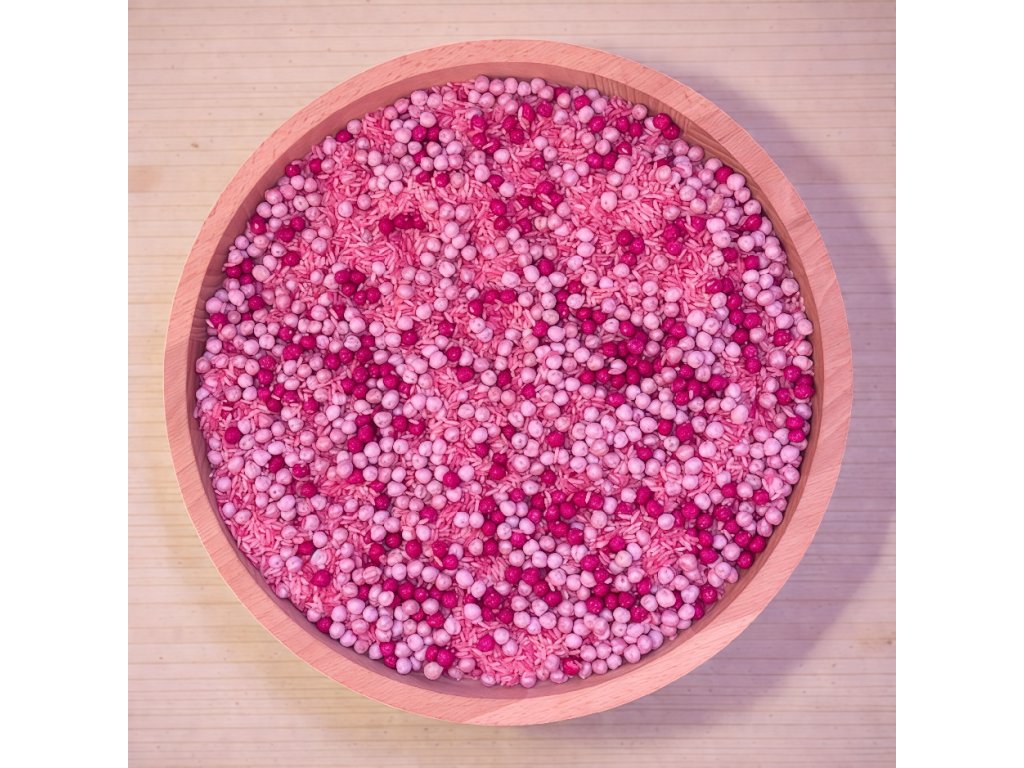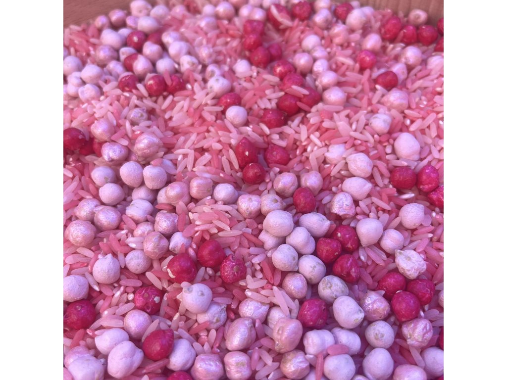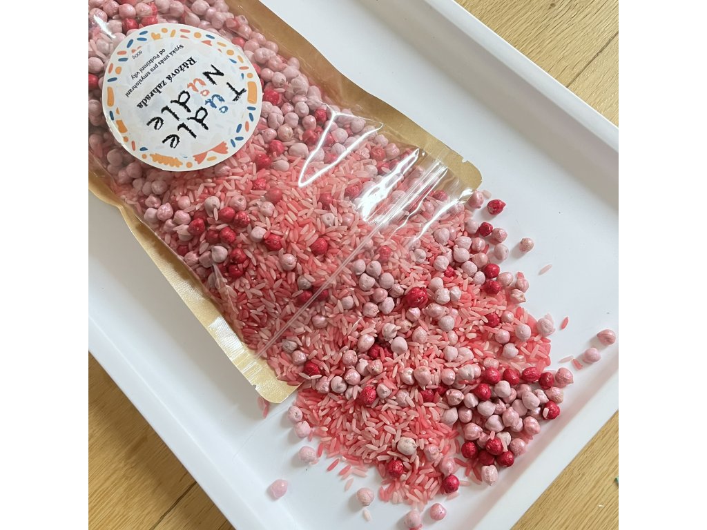 Tenhle mix cizrny a rýže hraje pestrými barvami, krásně se sype a je neodolatelný pro dětské zvídavé ručičky.